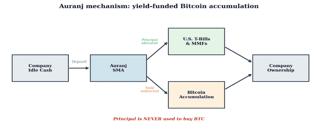 A company deposits idle cash into its Auranj-managed account. The principal is allocated to short-duration, low-risk instruments, specifically U.S. Treasury bills and money market funds. These instruments generate yield. That yield is systematically used to purchase Bitcoin on behalf of the company. The company retains full ownership of both the cash instruments and the BTC.