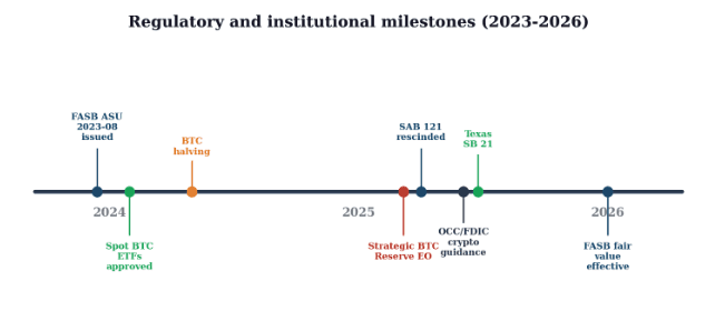 The regulatory and accounting environment for corporate Bitcoin holding has improved in concrete, measurable ways between 2024 and 2026. Several developments removed specific barriers that previously deterred corporate adoption.