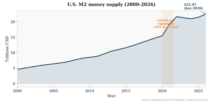 The root cause of dollar erosion is monetary expansion. The U.S. M2 money supply grew from approximately $15.4 trillion in January 2020 to $22.4 trillion by January 2026, an increase of roughly 45% in six years. [3, 4] Most of this expansion occurred in 2020–2021, driven by the Federal Reserve’s quantitative easing in response to COVID-19. Although M2 contracted briefly in 2022–2023, it resumed growth and hit new records by mid-2025, reaching $22.02 trillion in June 2025 at a 4.5% year-over-year growth rate. [5, 29]